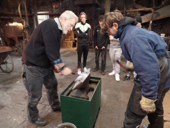 Von den Schmieden wurden wir einzeln in das Schmieden eingeführt. Wir mussten mit dem Hammer immer dahin schlagen, wo der Schmied zuvor geschlagen hatte. Dann wurde der Eisenstab in das Feuer gelegt und danach schlugen wir immer abwechselnd mit dem Schmied auf die gleiche Stelle auf das rotglühende Eisen. Der Vorgang musste immer wieder wiederholt werden, bis das fertige Messer im Wassereimer abgekühlt wurde. In der Werkstatt mussten wir das Messer anschließend mit Schmirgelpapier schleifen und mit Eisenfeilen so lange feilen, bis die Schlacke entfernt war und das Eisen glänzte. Das Messer durften wir mit nach Hause nehmen.