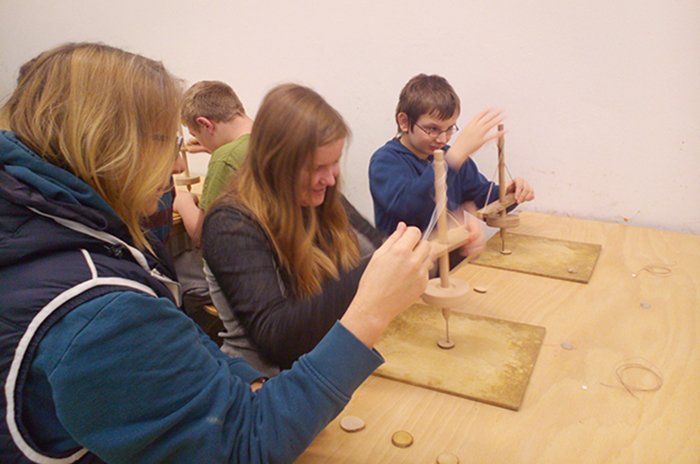 Nun ging es an die Arbeit mit dem Drillbohrer, um Löcher in Holzscheiben zu bohren und mit Muscheln und Perlen ein Steinzeitamulett herzustellen!